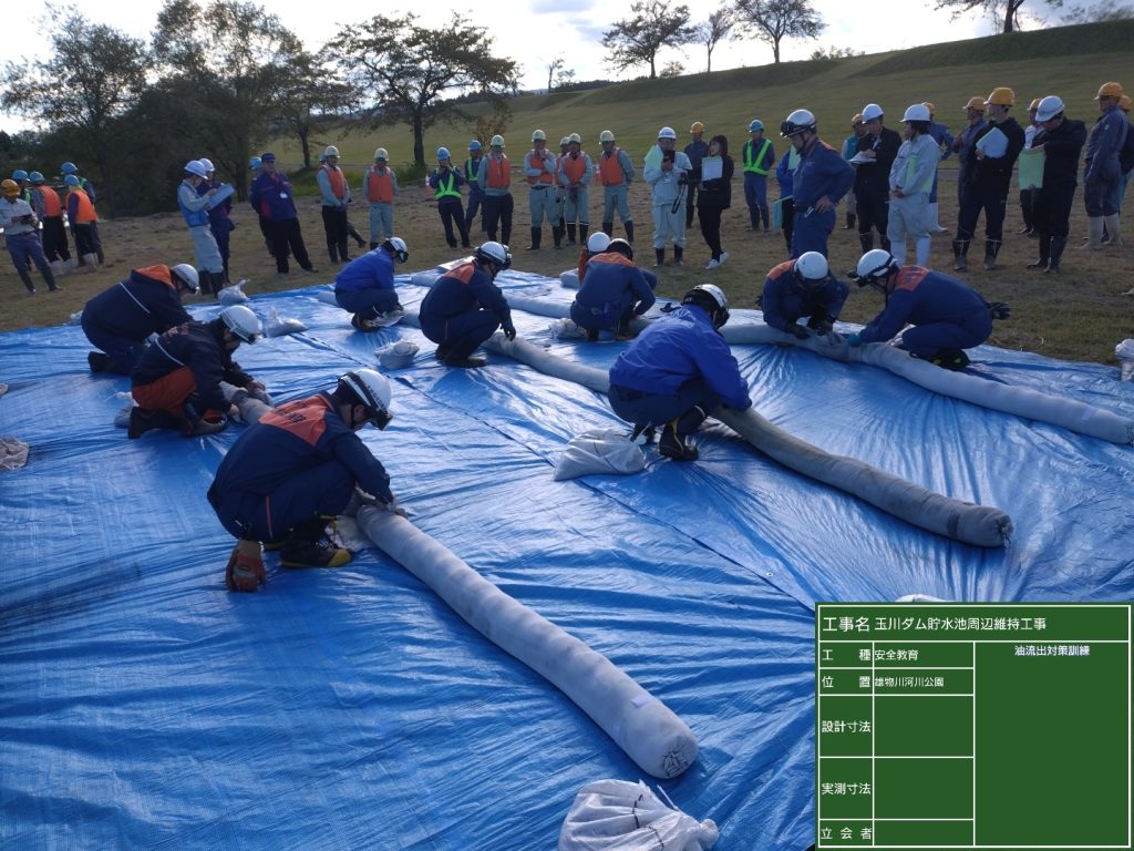 当社では、万一の油流出事故に備え、河川におけるオイルフェンスの組立・設置訓練に参加しています。