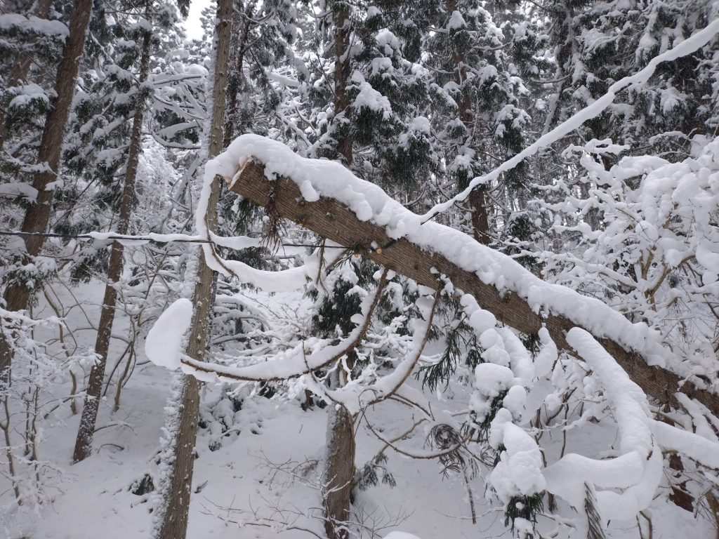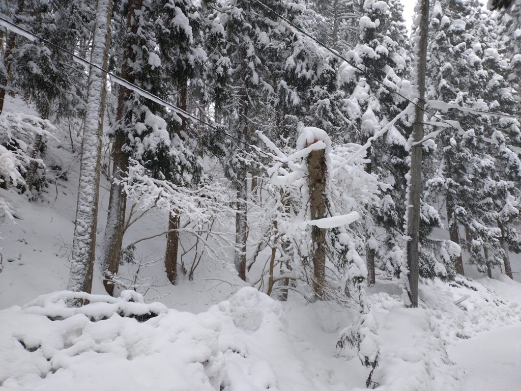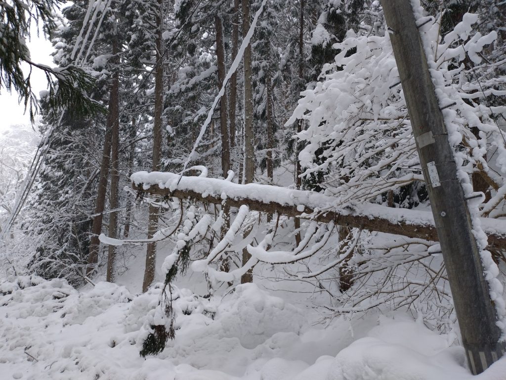 玉川ダム付近では、1月11日未明からの大雪の影響により、樹木に付着した雪の重みで枝が電線付近まで垂れ下がっている箇所や、耐えきれず折れてしまっている箇所が見受けられます。