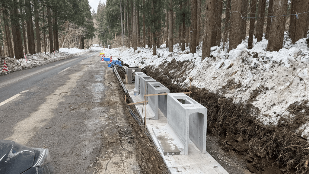側溝を入れるには掘削をしたり、丁張をかけたり、地盤をああだこうだしたりと大変なわけです。