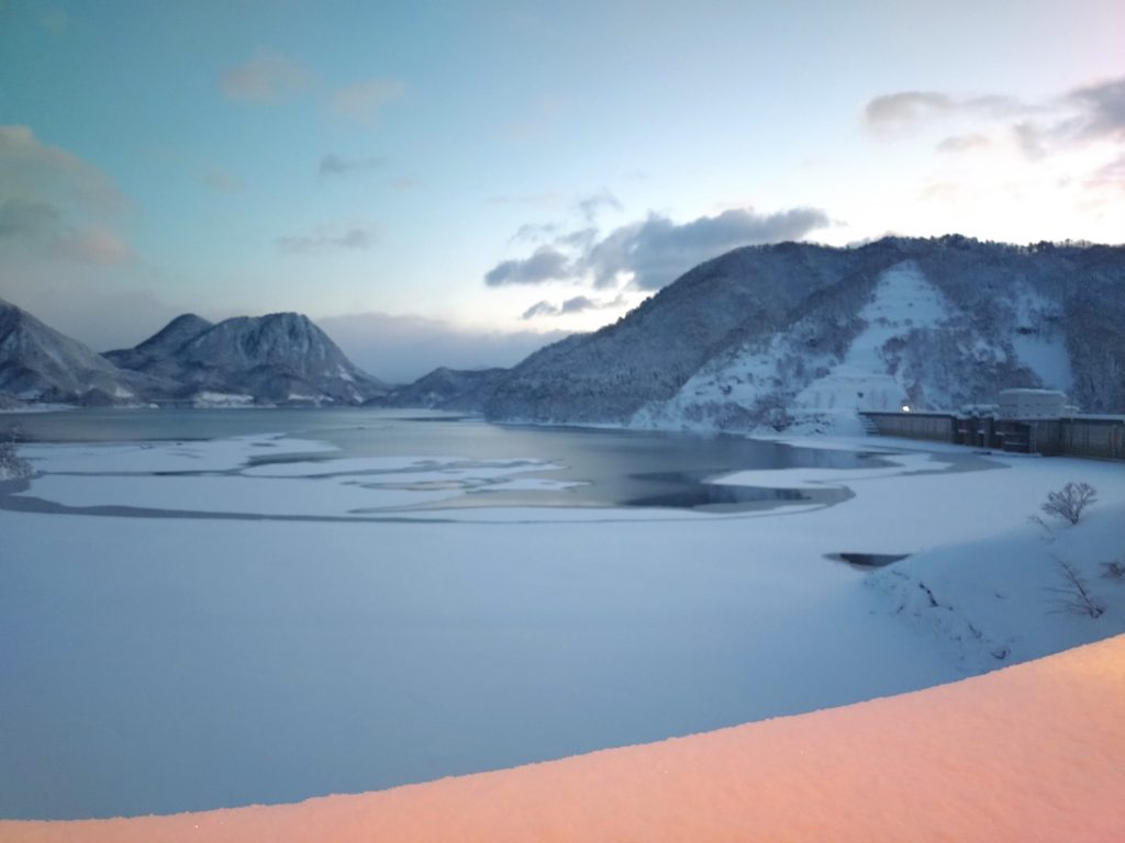 広報便り 晴れた朝の玉川ダム 全面結氷したダム湖の様子