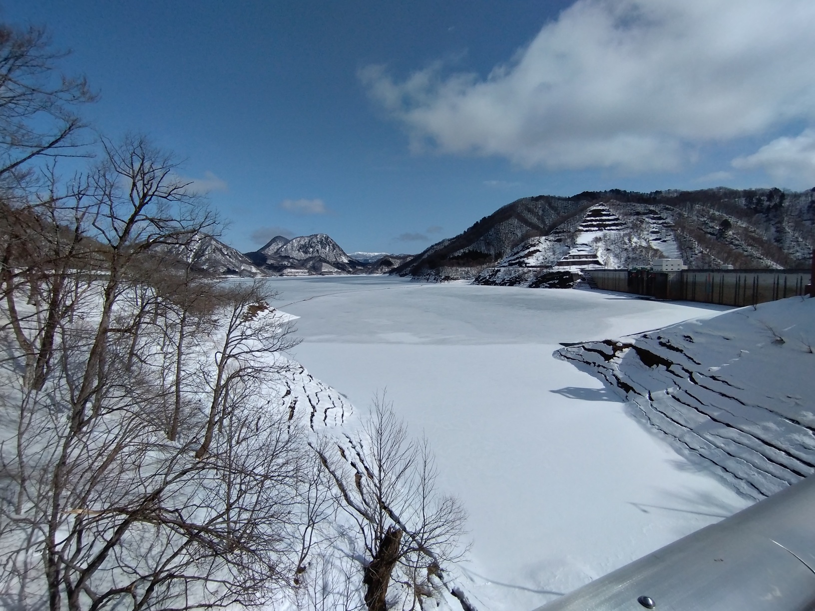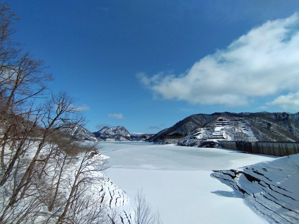 今朝、玉川ダムへ向かう橋の上からダム湖を見たところ、湖面が全面的に結氷している様子が見られました。